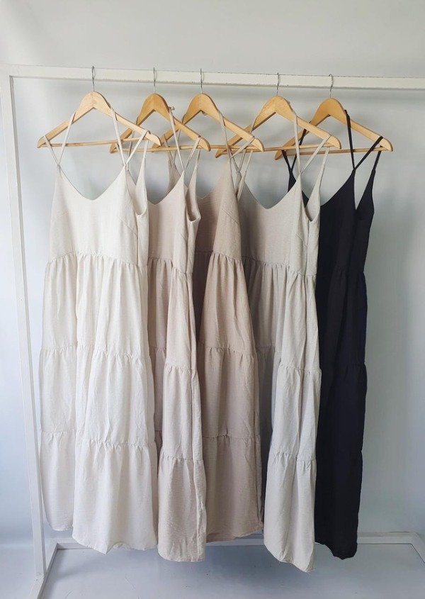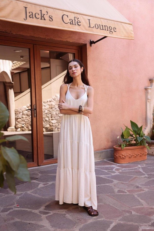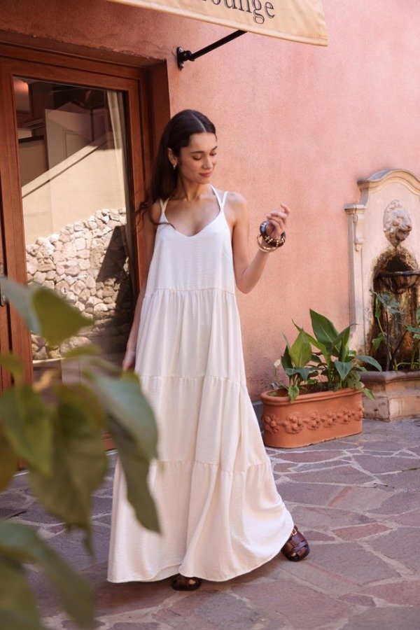 Vestido largo confeccionado en tela liviana y con caída natural. Presenta escote en v, breteles finos regulables y corte con volados amplios que aportan movimiento y frescura. Su diseño simple y femenino lo convierte en una prenda ideal para los dias de verano o para un look relajado y elegante.