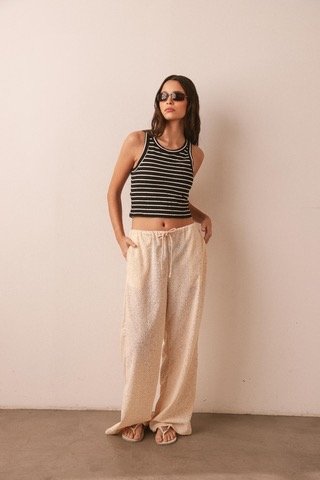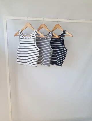 Musculosa confeccionada en tela de punto rayada, su calce ajustado la convierten en una prenda versátil y atemporal. Las tazas incorporadas permiten llevar los hombros al descubierto sin preocuparse por los breteles del corpiño.