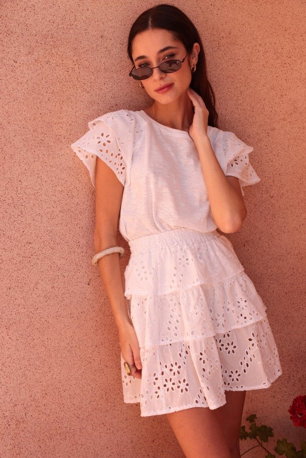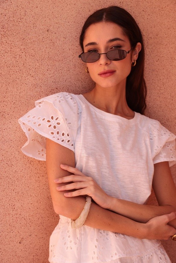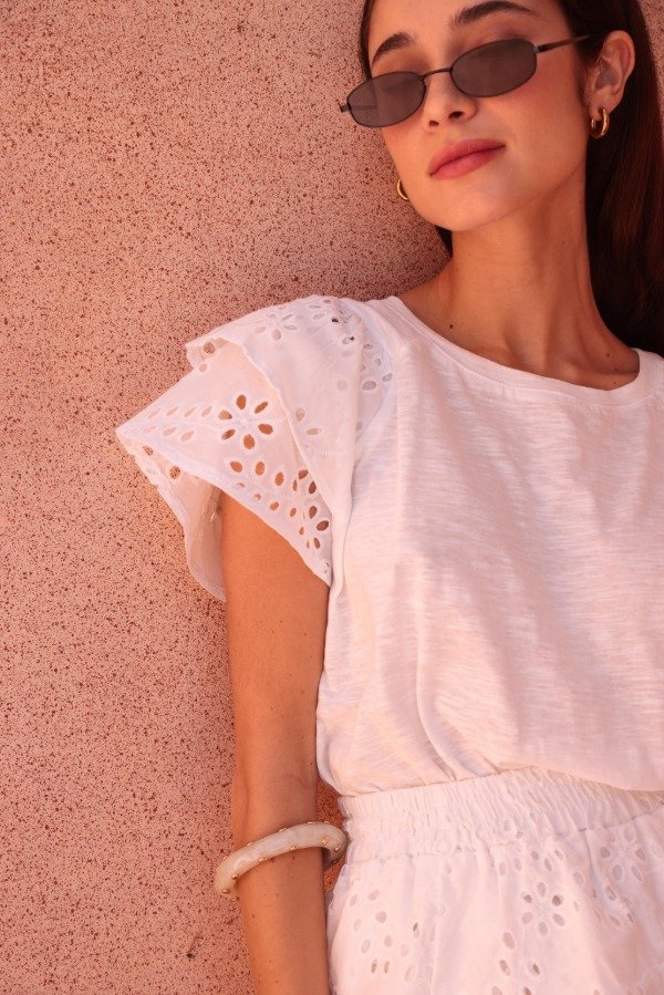 Remera confeccionada en algodón liviano con mangas cortas de broderie. Su diseño combina lo básico con un toque romantico gracias a los volados y al delicado trabajo del broderie. Calcé cómodo y fresco, ideal para usar todos los dias o elevar un look casual.