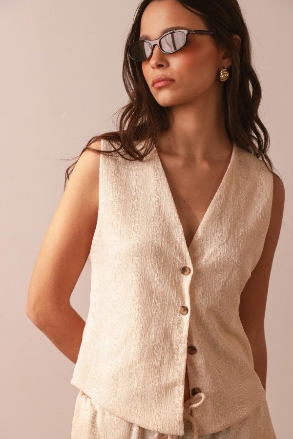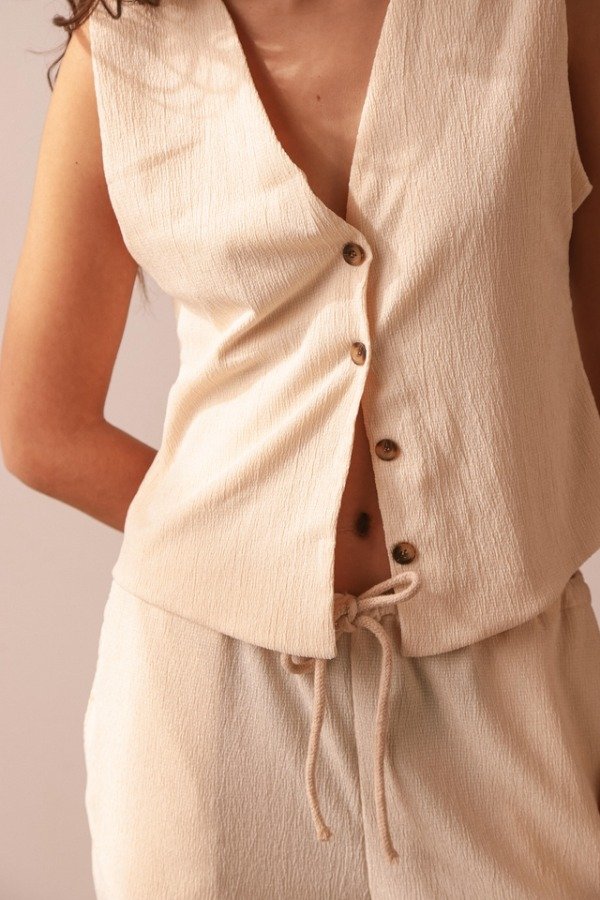 Chaleco de textura arrugada ideal para los dias cálidos o para armar looks relajados con un aire sofisticado. Presenta un corte recto, escote en v y botónes en madera que le aportan un detalle sutíl y elegante.
