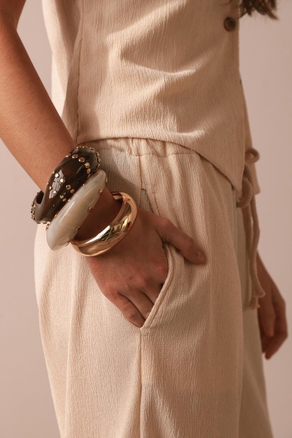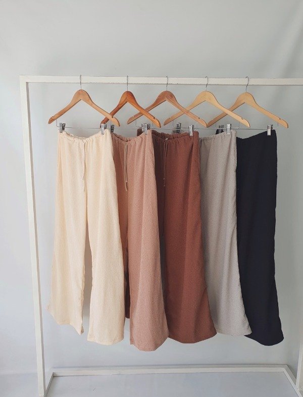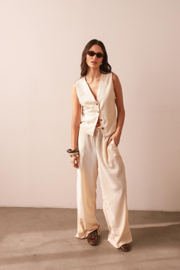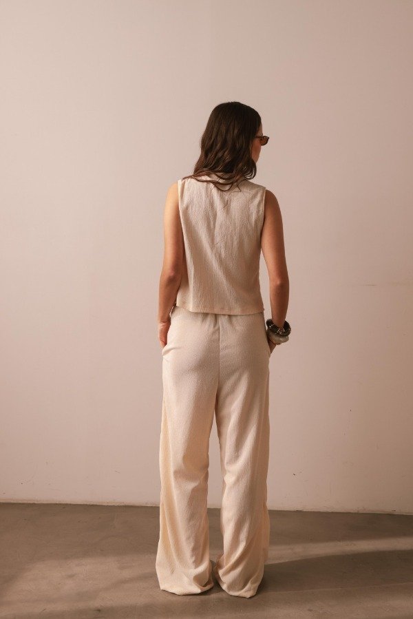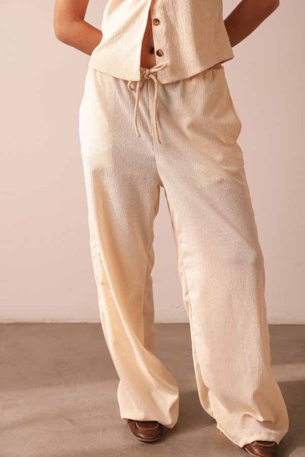 Pantalón de textura arrugada con corte amplio y fluido, ideal para climas cálidos o para llevar en looks relajados durante todo el año. Tiene elástico en cintura y bolsillos en los laterales.