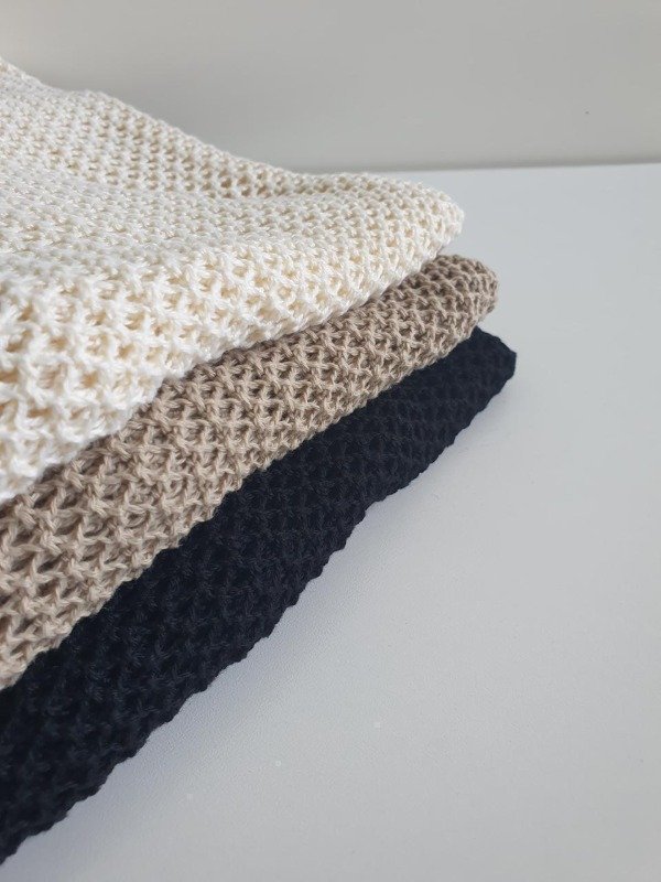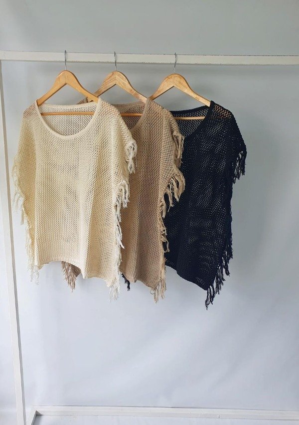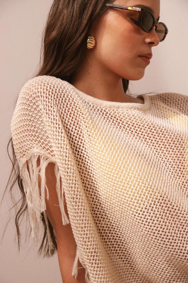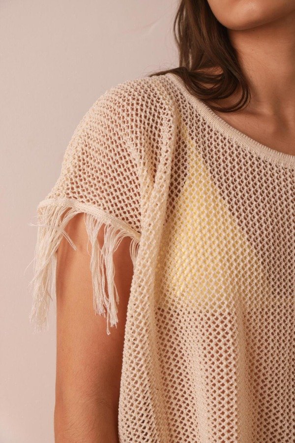 Tejido, escote redondo con flecos en los costados, ideal para este verano. Calado abierto, fabricado en Argentina.