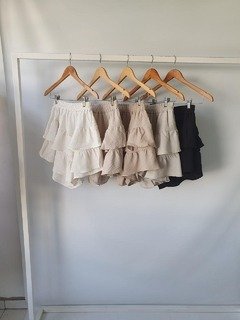 Short confeccionado en lino, de tiro alto y cintura con elástico. Su diseño destaca por las capas de volados superpuestos que aportan movimiento y un estilo femenino y relajado.