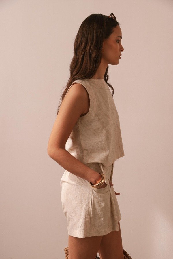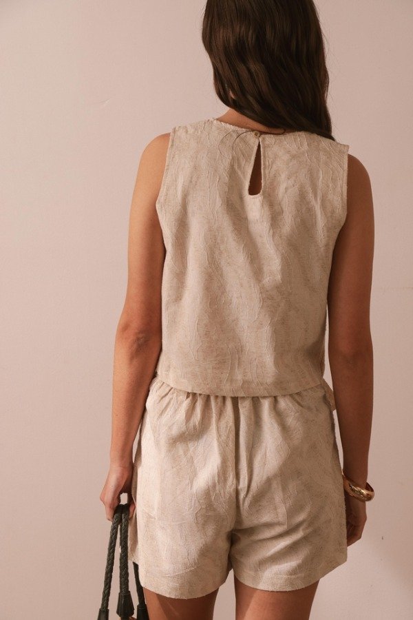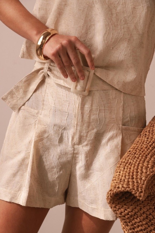 Short confeccionado en un delicado tejido texturizado y un diseño estructurado, aporta un aire sofisticado sin dejar de ser fresco y versátil. Incorpora un cinturon a juego con hebilla a tono y bolsillos laterales funcionales.