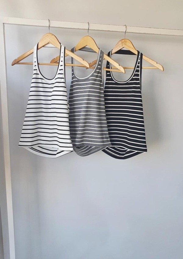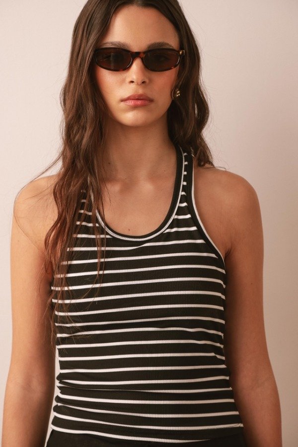 Musculosa confeccionada en tela de punto rayada, su calce al cuerpo y de escote redondo la convierten en una prenda básica y versátil. Las tazas incorporadas permiten llevar los hombros al descubierto sin preocuparse por los breteles del corpiño